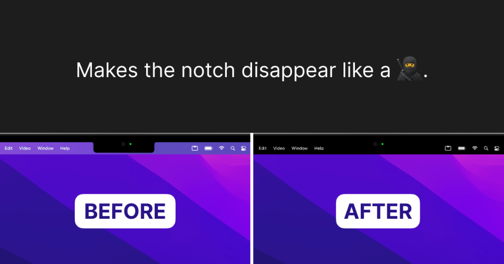 这是一款免费的 macOS 小工具,功能单一到极致——在屏幕顶部添加一条黑色遮罩,让菜单栏与刘海融为一体。最终效果就是:整块上缘成了一条纯黑色带,刘海也就“消失”了。